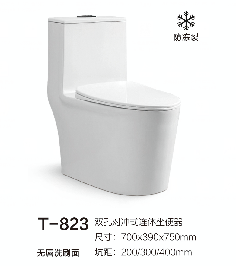 编号:T-823尺寸:700*390*750mm名称:描述:双孔对冲连体坐便器